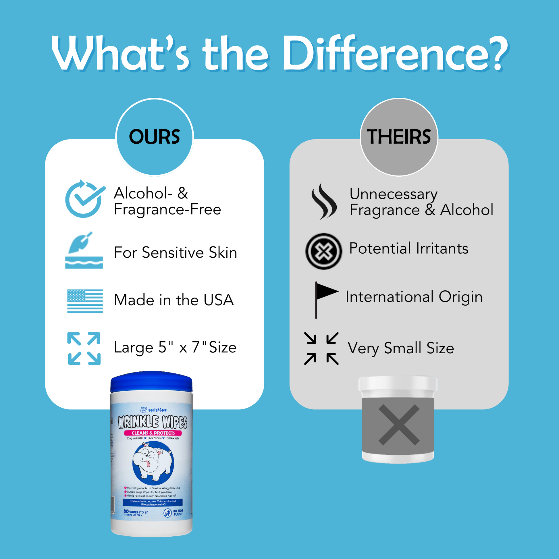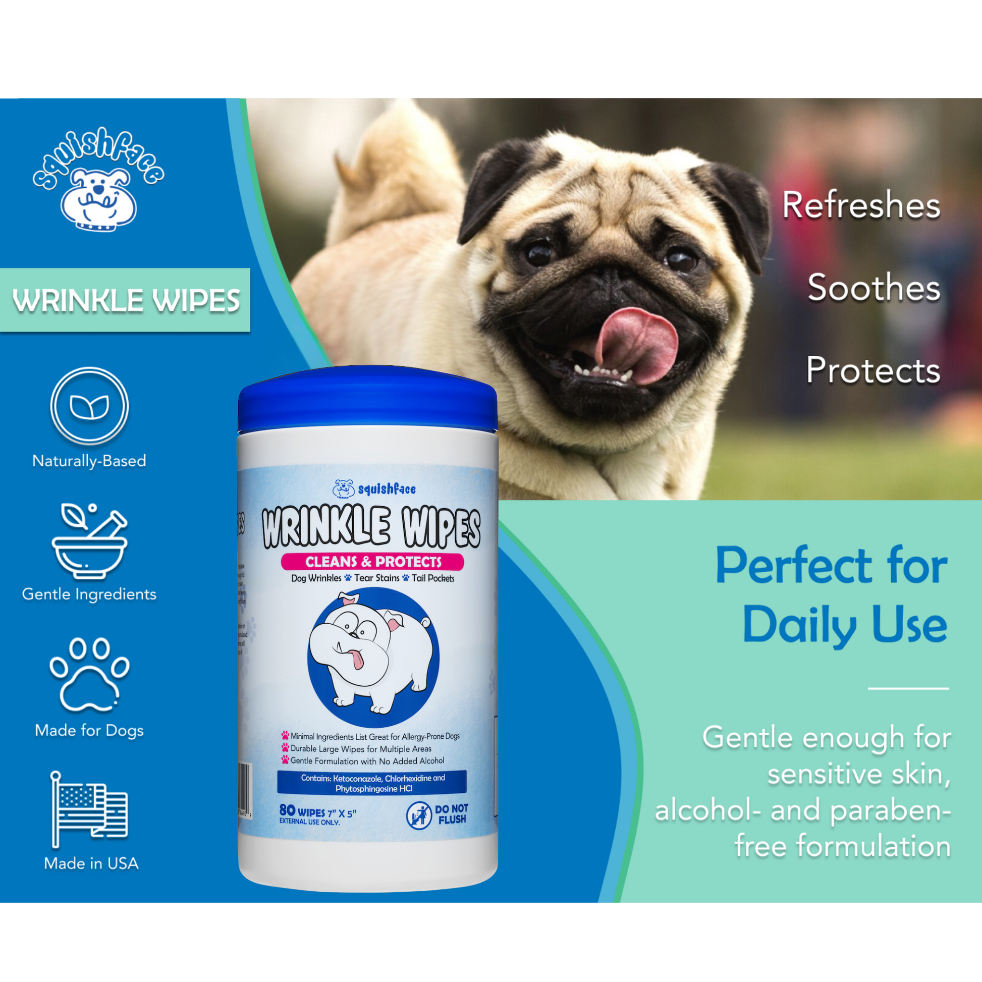 - Head-to-toe cleaning! Use on dog wrinkles, tear stains, tail pockets, paws, rear ends, and girly bits.