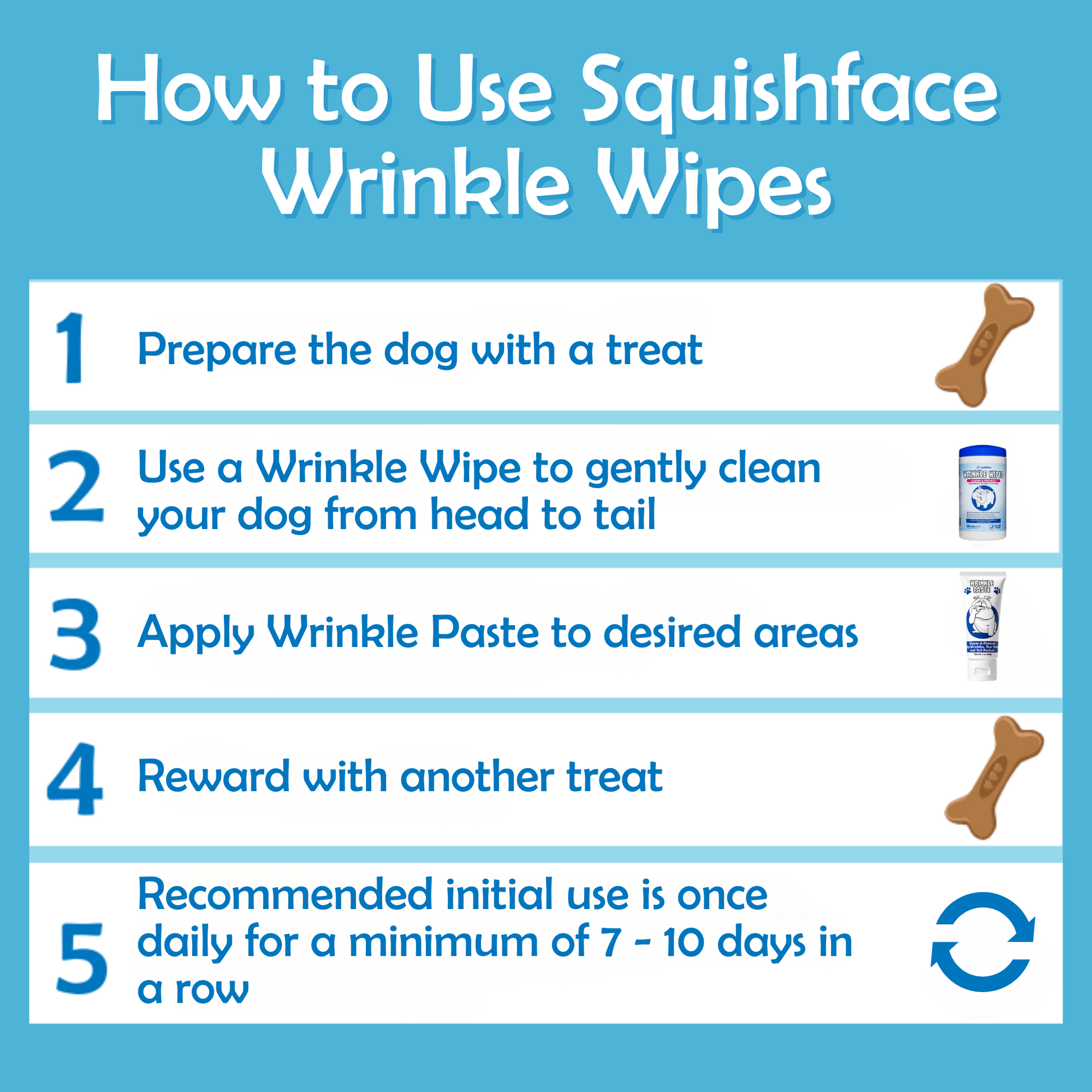 Use Squishface Wipes before application of Wrinkle Paste or Tear Stain Paste instead of soap and water, which can irritate. It’s recommended that you use the product for 7 – 10 days. Once you reach the desired results, apply once every other day or as needed for maintenance.